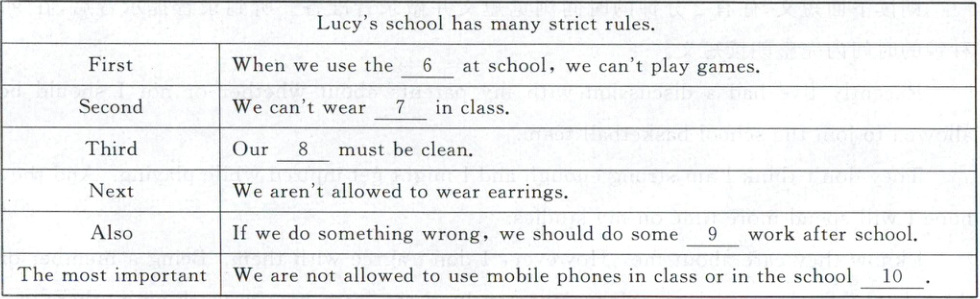 First, when they use the computers at school, they can't play games. Second, they can't wear hats in class. Third, their shirts must be clean. Next, they aren't allowed to wear earrings. Also, if they do something wrong in class, they should do some volunteer work after school. The most important rule is that they are not allowed to use mobile phones in class or in the school library.