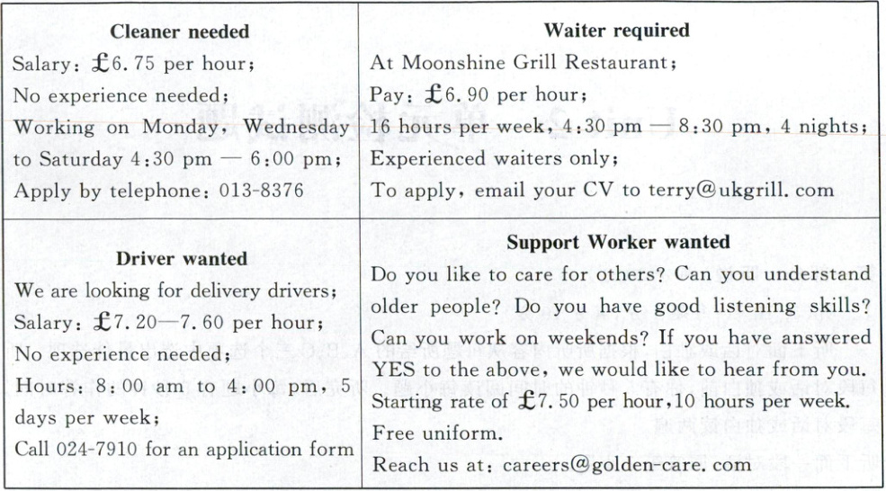 Maggie is a freshman at college. She wants to find a part-time job on weekends or after 5:00 pm every weekday. Here are some job ads from a newspaper.