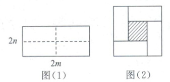 <题目>例5 如图(1)所示的是一个长为$2m$,宽为$2n$的长方形,沿图中虚线用剪刀将其均分成四个完全相同的小长方形,然后按图(2)的形状拼图.