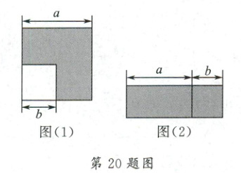 20. 如图(1)所示,边长为 $a$ 的正方形中有一个边长为 $b$ 的小正方形,如图(2)所示是由图(1)中阴影部分拼成的一个长方形.