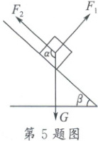 5. 一个物块静止在斜面上,其受力分析如图所示,重力$G$的方向竖直向下,支持力$F_{1}$的方向与斜面垂直,摩擦力$F_{2}$的方向与斜面平行. 若摩擦力$F_{2}与重力G方向的夹角\alpha的度数为132^{\circ}$,则斜面的坡角$\beta$的度数为(