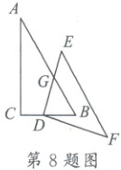 8. 将一副三角板按如图所示的位置摆放,$\angle C= \angle EDF = 90^{\circ}$,$\angle E = 45^{\circ}$,$\angle B = 60^{\circ}$,点$D在边BC$上,边$DE$,$AB交于点G$. 若$EF// AB$,则$\angle CDE$的度数为(