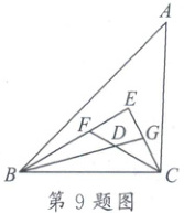 9. 如图,$\triangle ABC$中,$\angle ABC$,$\angle ACB的三等分线交于点E$,$D$,若$\angle BFC = 120^{\circ}$,$\angle BGC = 102^{\circ}$,则$\angle A$的度数为(