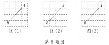8. 图(1)、图(2)、图(3)均是$4×4$的正方形网格,每个小正方形的边长为 1,每个小正方形的顶点称为格点,线段 AB 的端点均在格点上,只用无刻度的直尺,在给定的网格中,按下列要求以 AB 为边画$\triangle ABC$,要求: