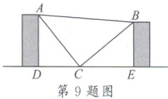 9. 一个等腰直角三角板如图搁置在两柜之间,且点D,C,E在同一直线上,已知稍高的柜高AD为80cm,两柜距离DE为140cm.求稍矮的柜高BE.