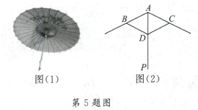 5. 如图(1),油纸伞是中国传统工艺品之一. 油纸伞的制作工艺十分巧妙,如图(2),伞圈$D沿着伞柄AP$滑动时,总有伞骨$BD = CD$,$AB = AC$,从而使得伞柄$AP始终平分同一平面内两条伞骨所成的\angle BAC$. 其中证明$\triangle ADB \cong \triangle ADC$的理由是(