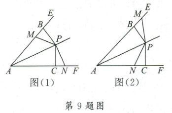 9. 已知:点P为∠EAF平分线上一点,PB⊥AE于B,PC⊥AF于C,点M,N分别是射线AE,AF上的点,且PM= PN.
