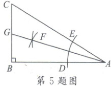 5. 如图,在Rt△ABC中,∠B= 90°,以点A为圆心,适当长为半径画弧,分别交AB,AC于点D,E,再分别以点D,E为圆心,大于$\frac { 1 } { 2 } D E$为半径画弧,两弧交于点F,作射线AF交边BC于点G,若BG= 1,AC= 4,则△ACG的面积是(