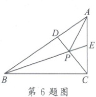 6. 如图,画一个∠BAC= 60°的△ABC,再分别作△ABC的两条角平分线BE和CD,BE和CD交于点P,连接AP. 有以下结论:①AP平分∠BAC;②PD= PE;③BD+CE= BC;④$S _ { \triangle P B D } + S _ { \triangle P C E } = S _ { \triangle P B C }$. 其中正确的序号是