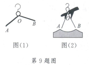 9. 由于木质衣架没有柔性,在挂置衣服的时候不太方便操作. 小敏设计了一种衣架,在使用时能轻易收拢,套进衣服后松开即可. 如图(1),衣架杆 $OA = OB = 18\ cm$,若衣架收拢时,如图(2),$\angle AOB = 60^{\circ}$,则此时 $A$,$B$ 两点之间的距离是