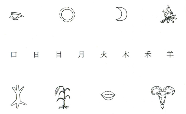 连线:眼睛-目,太阳-日,月亮-月,火焰-火,树-木,禾苗-禾,嘴巴-口,羊头-羊;书写:目 日 月 火 木 禾 口 羊