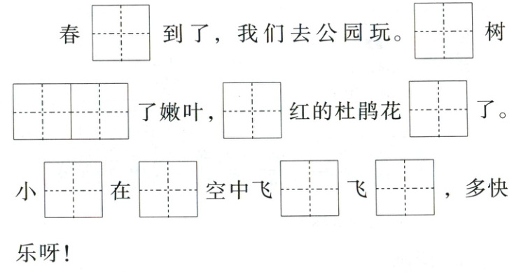 春(天)到了,我们去公园玩。(小)树(长出)了嫩叶,(火)红的杜鹃花(开)了。小(鸟)在(天)空中飞(来)飞(去),多快乐呀!