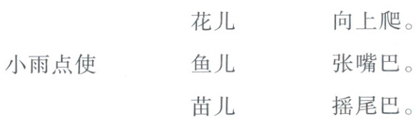 1.ABC 2.小雨点使——花儿——张嘴巴;小雨点使——鱼儿——摇尾巴;小雨点使——苗儿——向上爬。