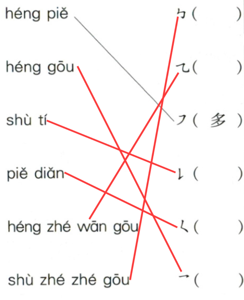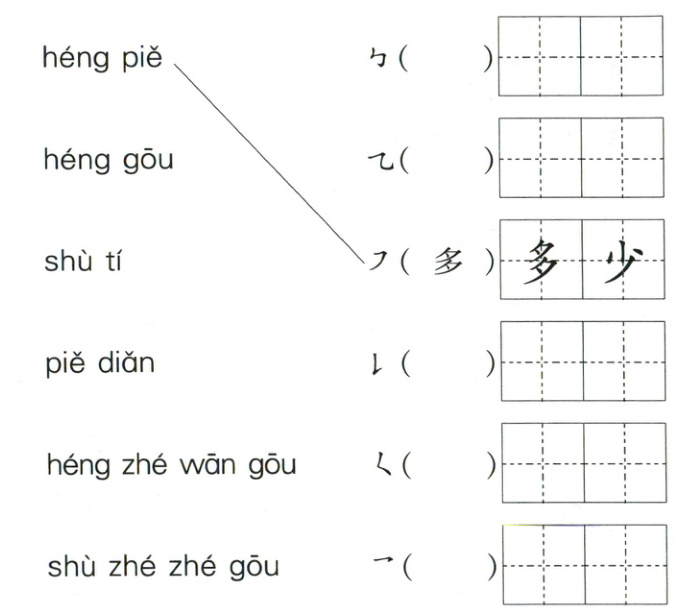 七、照样子,连一连,再写出带有这个笔画的字,并组词。(15分)