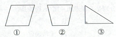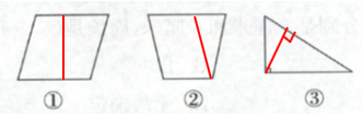 2. 在下面的图形上各加一条线,使图①变成两个完全一样的梯形;使图②变成一个三角形和一个平行四边形,并分别作出它们的高;在图③中以斜边为底作高。(共 5 分)