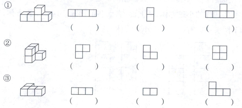 7. 丁丁用同样大小的正方体搭出了下面的立体图形,根据要求选择适当的序号填在下面的括号里。