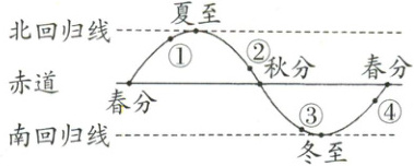 5. 如图所示为太阳直射点在地球表面移动的示意图,①②③④四处的时间中,与正月十五最接近的是(