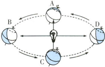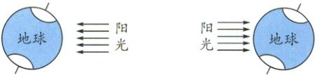 如下图所示为地球公转的模拟实验,把一盏灯当作太阳,将一个地球仪自西向东绕灯旋转,观察灯光照射在地球表面的光线变化。