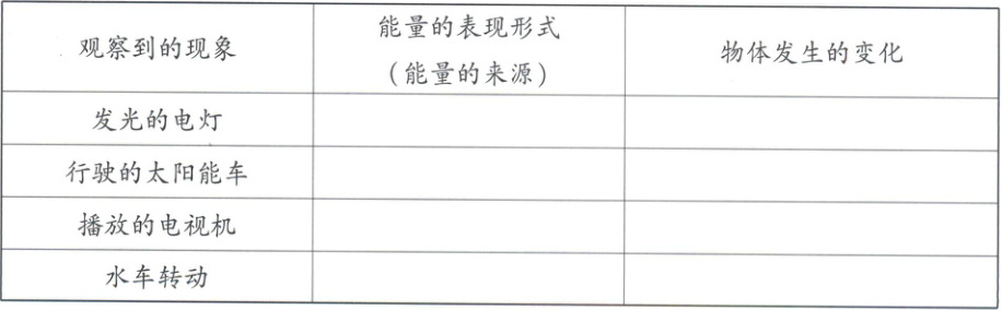 观察生活中一些常见的现象,想一想它们的能量来源是什么,物体会发生哪些变化,把表格补充完整。