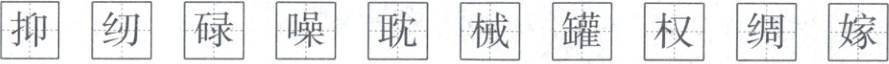 抑(左窄右宽) 纫(左窄右宽) 碌(左窄右宽) 噪(左窄右宽) 耽(左窄右宽) 械(左窄右宽) 罐(左宽右窄) 权(左窄右宽) 绸(左窄右宽) 嫁(左窄右宽) (书写在对应田字格中,保证结构正确、笔画规范即可)