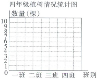 1. 统计图中 1 小格表示 1 棵树。2. 四年级一班的同学植树最多,达到 9 棵;二班的同学植树最少,只植了 4 棵。3. 四年级同学植树总数是 9+4+7+8=28(棵)。8÷4=2,四班的植树总数是二班植树棵数的 2 倍。