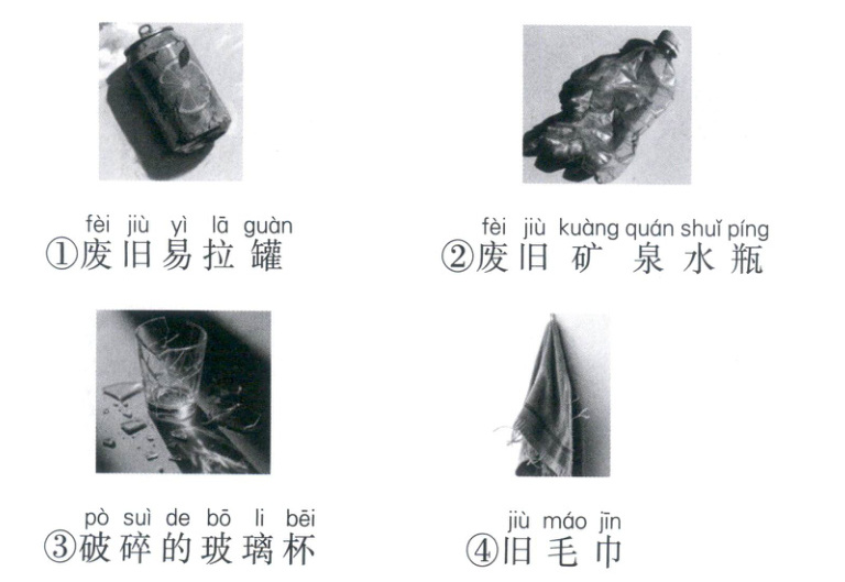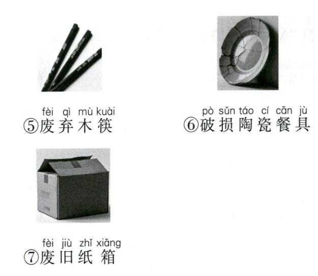1. 金属:①;玻璃:③;纸:⑦;木头:⑤;布:④;陶瓷:⑥;塑料:②