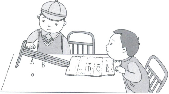 1. 小球从$A$点滚下来,落在$C$点处。那么,小球从$B$点滚下来会落在哪个位置呢?在你认为正确的位置上画“√”。