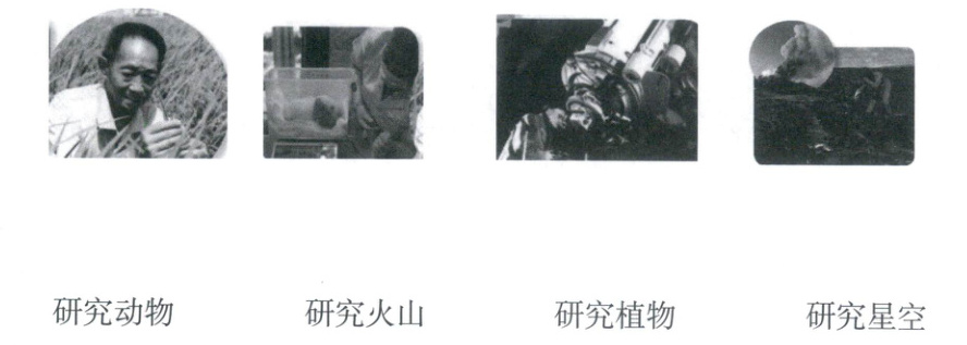 第一张图-研究植物;第二张图-研究动物;第三张图-研究星空;第四张图-研究火山