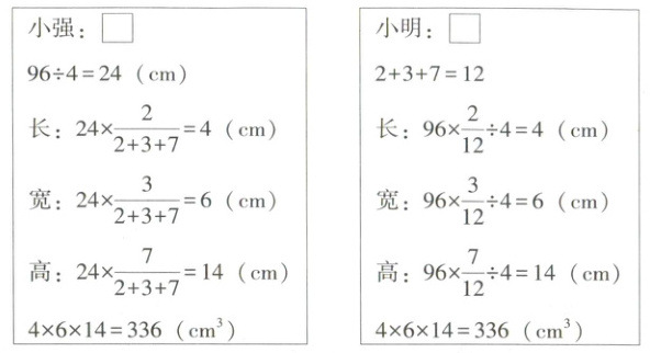 先算$2 + 3+7 = 12$,$96×\frac{2}{12}$表示的是$4$条长的长度和,再除以$4$得到长$96×\frac{2}{12}÷4 = 4(cm)$;同理$96×\frac{3}{12}÷4 = 6(cm)$得到宽,$96×\frac{7}{12}÷4 = 14(cm)$得到高,最后算出体积$4×6×14 = 336(cm^3)$,小明的解法正确。
