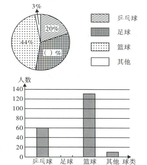 某中学就该校学生最喜欢哪种球类进行了一次调查,并将调查结果制成了统计表,条形统计图和扇形统计图,请你根据图表信息完成下列各题。