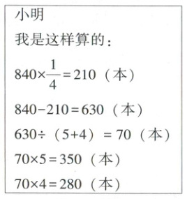 4. 学校图书馆运进图书 840 本,其中的$\frac{1}{4}$借给了四年级,其余的按 5:4 借给五年级和六年级,三个年级各从图书馆借图书多少本?(7 分)