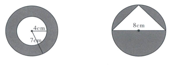 $3.14×7^{2}-3.14×4^{2}=103.62$($cm^2$)$3.14×4^{2}-8×4÷2=34.24$($cm^2$)