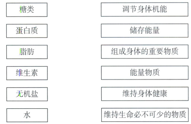 糖类—能量物质;蛋白质—组成身体的重要物质;脂肪—储存能量;维生素—调节身体机能;无机盐—维持身体健康;水—维持生命必不可少的物质