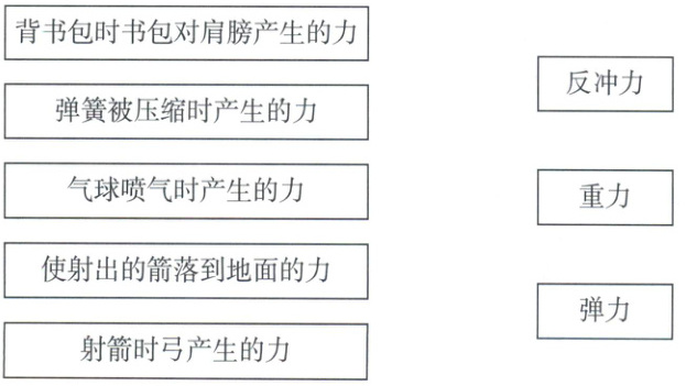 背书包时书包对肩膀产生的力——重力;弹簧被压缩时产生的力——弹力;气球喷气时产生的力——反冲力;使射出的箭落到地面的力——重力;射箭时弓产生的力——弹力