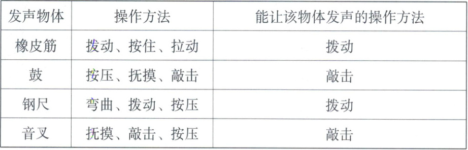 实验现象:橡皮筋拨动时、鼓敲击时、钢尺拨动时、音叉敲击时会发出声音,且发声时物体在振动。