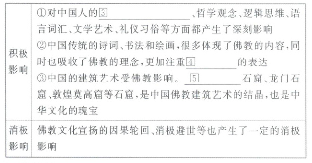 、哲学观念、逻辑思维、语言词汇、文学艺术、礼仪习俗等方面都产生了深刻影响②中国传统的诗词、书法和绘画,很多体现了佛教的内容,同时也吸收了佛教的理念,更加注重⓸