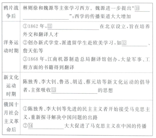 |鸦片战争后|林则徐和魏源等主张学习西方。魏源进一步提出“⑩师夷之长技以制夷”;西学的传播渠道大大增加|