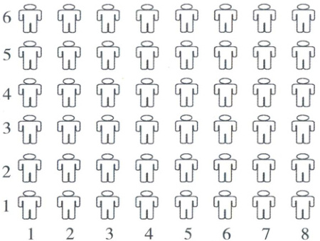 1. 小华坐在第$6$列、第$4$行,他的位置用数对表示是$(6,4)$;东东的位置用数对表示是$(5,3)$,他坐在第$5$列、第$3$行。
