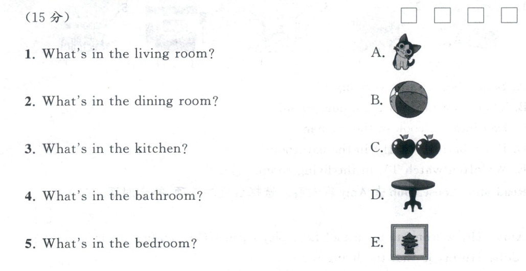 四、Listen and match. Linda 向大家介绍自己的家。听短文,将句子与合适的图片连线。(15 分)