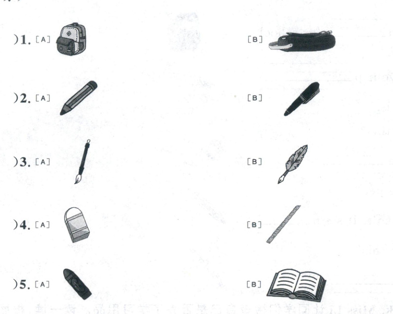 四、Listen and choose. Lingling 帮 Qiqi 整理好学习用品。听录音,选择合适的图片。(10分)