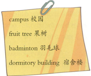 On the right, there is a garden with many fruit trees. Next to the garden is a sports centre. Teachers and students like playing basketball there after school. And there are also sports fields for volleyball and badminton.