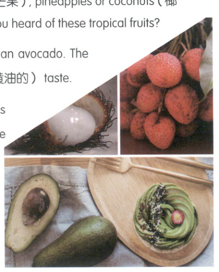 Look, is that a pear? No. It just looks like one. It is an avocado. The fruit is rich in vitamins. It has a very smooth, buttery (像黄油的) taste.