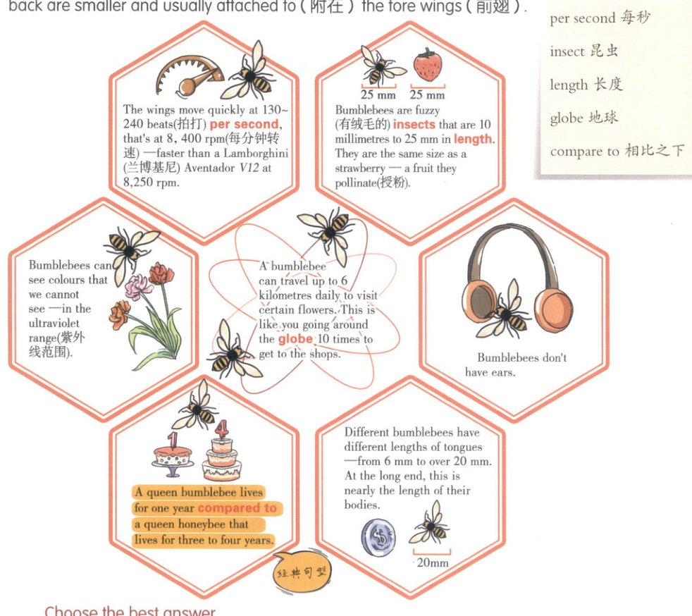 1.C 2.D 3.A 4.B【解析】推理判断题。根据原文中间 “A bumblebee can travel up to 6 kilometres daily to visit certain flowers.” 可知,大黄蜂每天可以飞行6千米就为了找到某些花。故选 B。5.C【解析】推理判断题。根据原文 “Bumblebees can see colours that we cannot see—in the ultraviolet range.” 可知,在紫外线范围内,大黄蜂可以看到我们看不到的颜色。因此可以推断它们看到的颜色比人类多。故选 C。