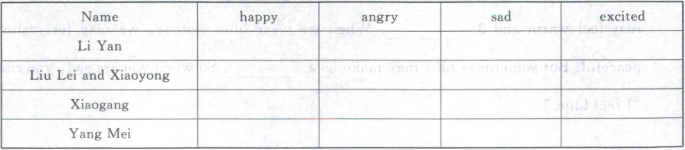 四、Listen and tick. Li Yan和同学们在公园玩,他们的心情怎么样?听录音,在相应的表格内打“√”。(10分)