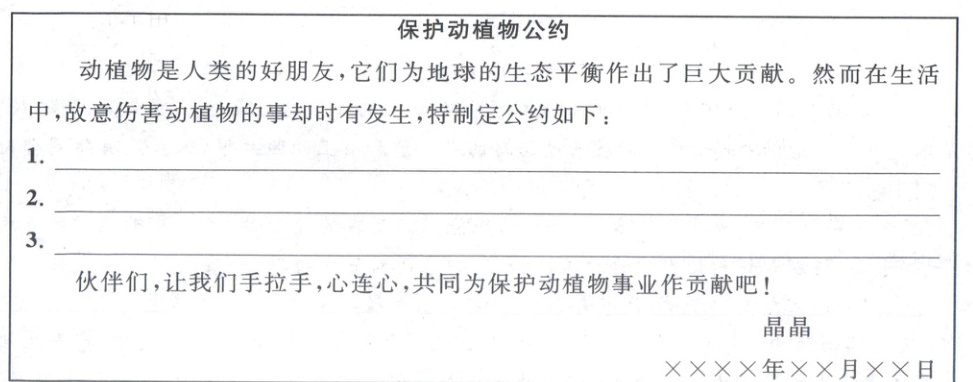 生活中,偶尔会看到有伤害动植物的不良行为,为此,晶晶想制定一则动植物保护公约,来呼吁人们爱护动植物。请你来帮帮晶晶吧!