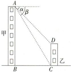 4. 如图,有甲、乙两座建筑物,从甲建筑物 $A$ 点处测得乙建筑物 $D$ 点的俯角 $\alpha$ 为 $45^{\circ}$,$C$ 点的俯角 $\beta$ 为 $58^{\circ}$,$BC$ 的长为两座建筑物的水平距离. 已知乙建筑物的高度 $CD$ 为 $6$ m,求甲建筑物的高度 $AB$.($\sin 58^{\circ} \approx 0.85$,$\cos 58^{\circ} \approx 0.53$,$\tan 58^{\circ} \approx 1.60$,结果保留整数)