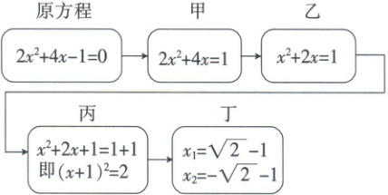 $\begin{matrix}\begin{matrix}原方程 \\\begin{matrix}2x^2 + 4x - 1 = 0\end{matrix} \end{matrix} & \xrightarrow{甲} & \begin{matrix}甲 \\\begin{matrix}2x^2 + 4x = 1\end{matrix} \end{matrix} & \xrightarrow{乙} & \begin{matrix}乙 \\\begin{matrix}x^2 + 2x = 1\end{matrix} \end{matrix} \\& & & & \downarrow \\& & & & \begin{matrix}丙 \\\begin{matrix}x^2 + 2x + 1 = 1 + 1 \\即(x + 1)^2 = 2\end{matrix} \end{matrix} & \xrightarrow{丁} & \begin{matrix}丁 \\\begin{matrix}x_1 = \sqrt{2} - 1 \\x_2 = -\sqrt{2} - 1\end{matrix} \end{matrix}\end{matrix}$
