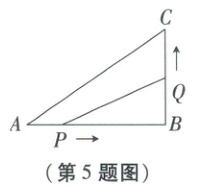 5. 如图,在 $\triangle ABC$ 中,$\angle ABC = 90^{\circ}$,$AB = 8\ cm$,$BC = 6\ cm$。动点 $P$,$Q$ 分别从点 $A$,$B$ 同时开始移动,点 $P$ 的速度为 1 cm/s,点 $Q$ 的速度为 2 cm/s,点 $Q$ 移动到点 $C$ 后停止,点 $P$ 也随之停止。当 $\triangle PBQ$ 的面积为 15 $cm^{2}$ 时,点 $P$ 移动了(