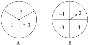 7. 如图,两个可以自由转动的转盘均被半径分成了标有数字的扇形区域,每个扇形圆心角的度数如图所示。小亮和小周做游戏,规则如下:小亮、小周分别转动转盘 $ A $,$ B $,待转盘自动停止后,指针指向扇形内部,则该扇形内部的数字即为转出的结果(若指针指向两个扇形的交线,则此次转动无效,重新转动,直到两个转盘的指针均指向扇形的内部为止)。若两个转盘所得数字乘积为 $ 1 $,则小亮赢,否则小周赢。