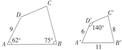 10. 如图,四边形 $ABCD \sim $ 四边形 $A'B'C'D'$,且 $\angle A = 62^{\circ}$,$\angle B = 75^{\circ}$,$\angle D' = 140^{\circ}$,$AD = 9$,$A'B' = 11$,$A'D' = 6$,$B'C' = 8$.
